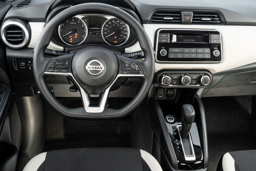 Conforto é uma das premissas e o acabamento transmite cuidado tanto na montagem quanto na escolha dos materiais. A cabine possui o quadro de instrumentos em TFT e o volante multifuncional semelhantes ao do Kicks. O multimídia de 7″ tem conectividade Android Auto/Apple CarPlay. Além disso, o Nissan Versa exibe revestimentos imitando fibra de carbono nas laterais de portas.