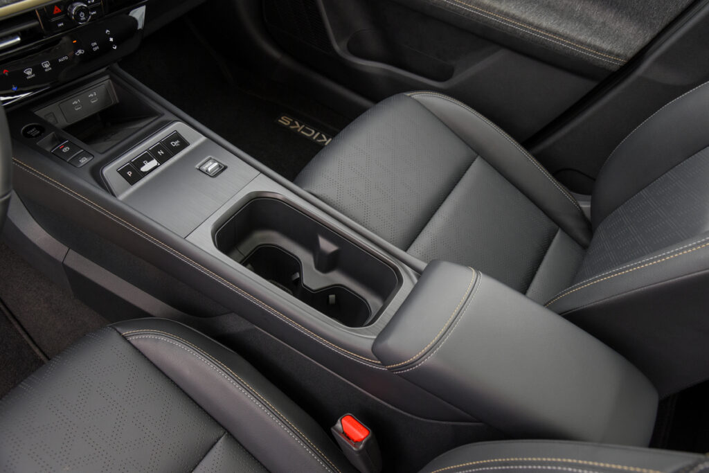 Além da garantia de conforto para os passageiros, o novo Nissan Kicks também é generoso com a carga. Na cabine, o modelo conta com 19 espaços para acomodação de objetos. Os porta-copos nas portas e console central são grandes o suficiente para acomodar garrafas de até 1 litro – os que ficam entre os bancos têm ajustes de tamanho. Nessa área central, no apoio de braços, há ainda um espaçoso compartimento. Já o encosto do meio do banco traseiro abriga outro apoio com espaço para dois copos, quando rebatido.