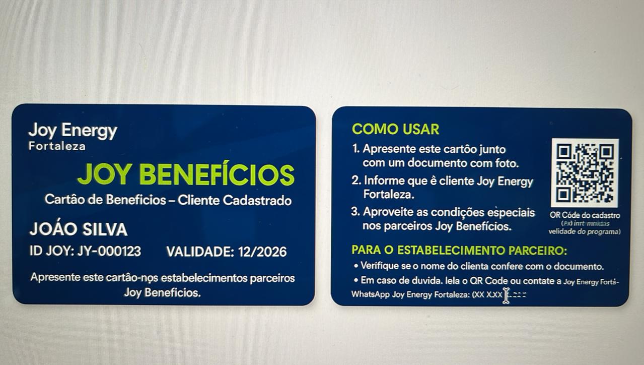 O Eletroposto Joy Energy Fortaleza inova mais uma vez e acaba de criar um cartão de benefícios, sem custo adicional. É o Cartão Joy Benefícios, feito para quem faz parte da rotina do eletroposto em Fortaleza. Com ele, você continua carregando seu veículo elétrico ou híbrido normalmente na Joy e, além disso, passa a ter descontos exclusivos em parceiros. Tudo isso sem pagar nada a mais por mês (ANDRÉ MARINHO – JORNALISTA)