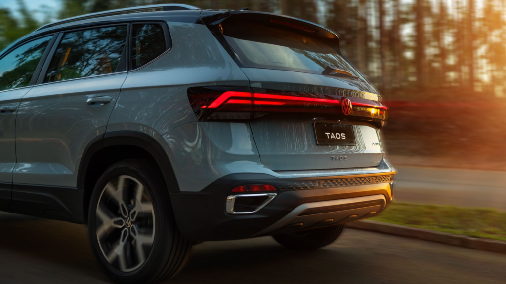 Na linha 2026, o Novo Taos ganhou um visual que valorizou ainda mais as linhas do modelo. Na dianteira, os faróis, a grade e o para-choque foram completamente renovados. Na traseira, a nova light strip com iluminação em LED conecta as lanternas e forma um conjunto único. Outra novidade visual é o logotipo traseiro com iluminação.