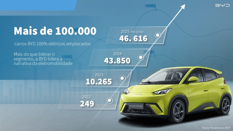 Desde o início das operações no Brasil, há pouco mais de três anos, a BYD já emplacou mais de 100 mil carros elétricos no território nacional e é líder absoluta no ranking dos BEVs, superando em mais de sete vezes a segunda colocada. O volume de vendas da greentech é quase o triplo da soma dos veículos comercializados no mesmo período por todos os concorrentes que ocupam da segunda à décima posição no ranking, segundo dados da Fenabrave.